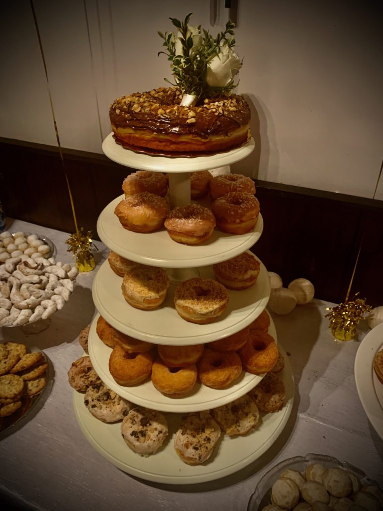 On the other hand, maybe you and your fiancĂ© are just the kind of wedding mavericks that enjoy breaking with tradition! More and more couples are deciding to break with wedding traditions in ways that may have seemed unthinkable in previous generations. Some of our favourite alt-wedding cake creations over the years have included: wedding pies (delivered to each guest table and a single elaborate pie cut by the happy couple for pictures), an “All Canadian” butter tart tier with a giant tart topper, a giant French macaron display, and the gourmet donut tier pictured here with the big wedding donut topper!